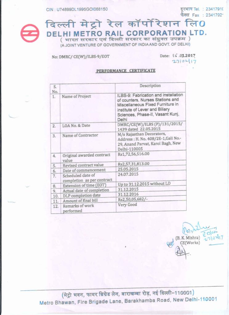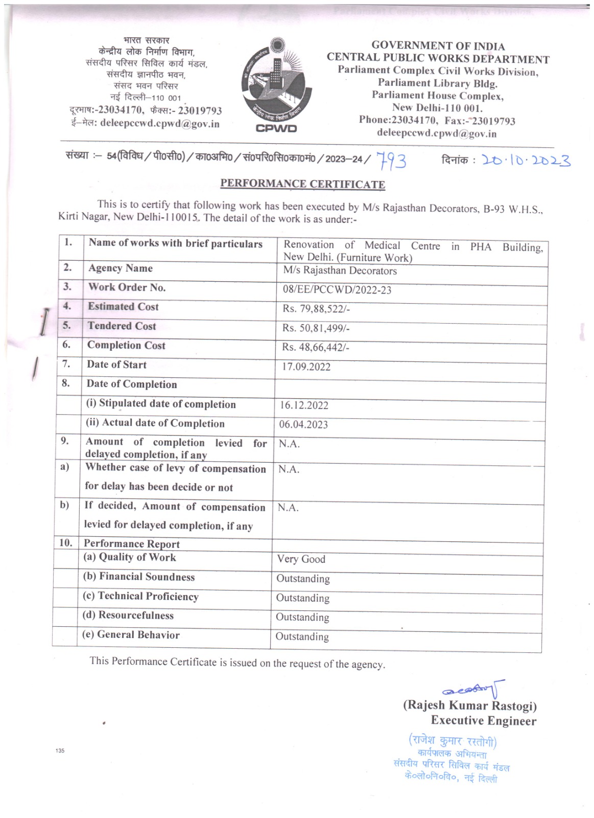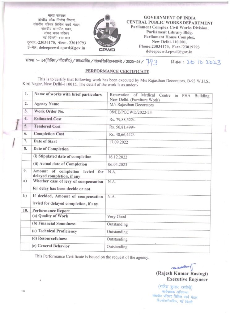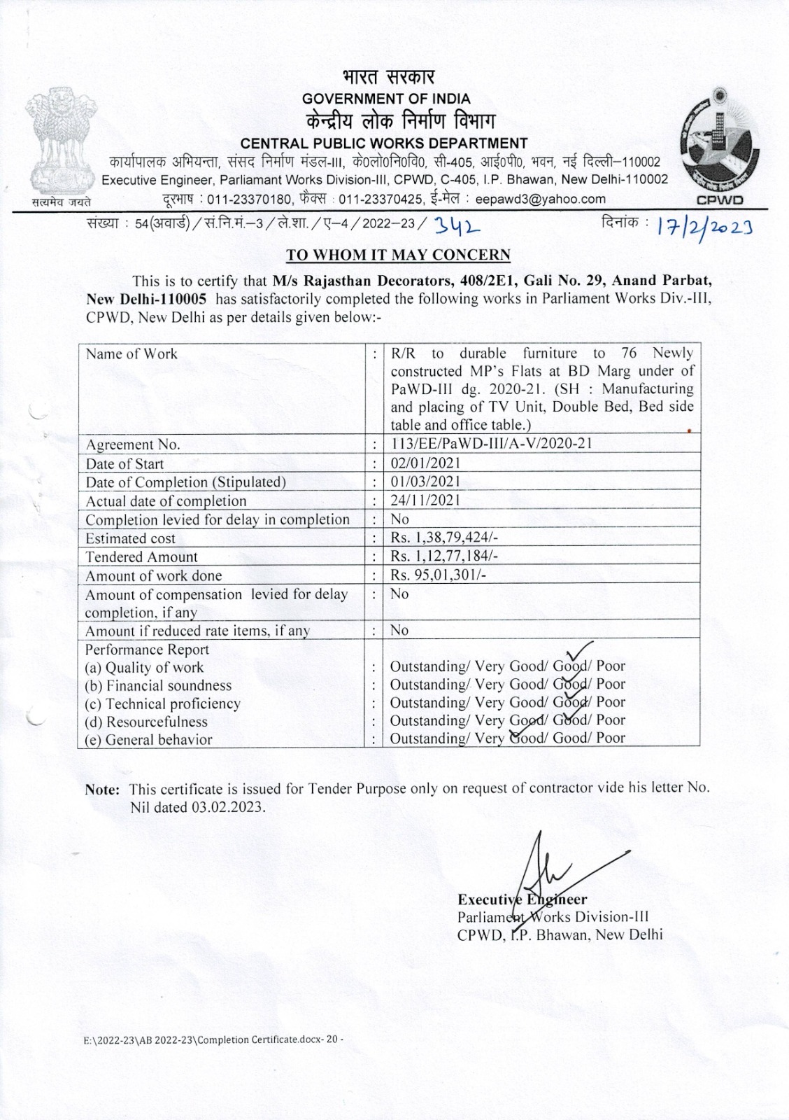 With decades of industry presence, we have successfully executed a wide range of government and institutional furniture and interior projects across India. Our portfolio includes assignments completed under CPWD, Parliament Works Division, Delhi Metro Rail Corporation (DMRC), educational institutions, medical centres, and other public sector bodies.Each project reflects our commitment to quality craftsmanship, technical compliance, financial discipline, and timely execution. Our performance ratings of “Very Good” and “Outstanding” across multiple government works demonstrate our reliability and execution excellence.